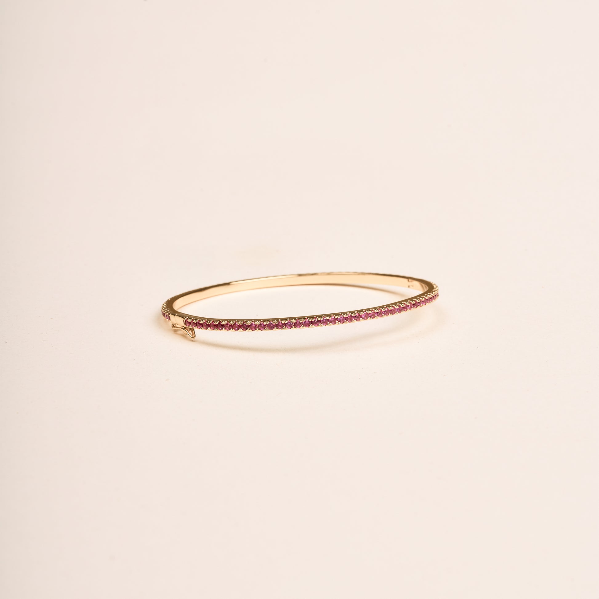 A slim gold bangle lined with soft pink stones for a subtle, feminine touch. Elegant on its own or stacked for a chic layered style.