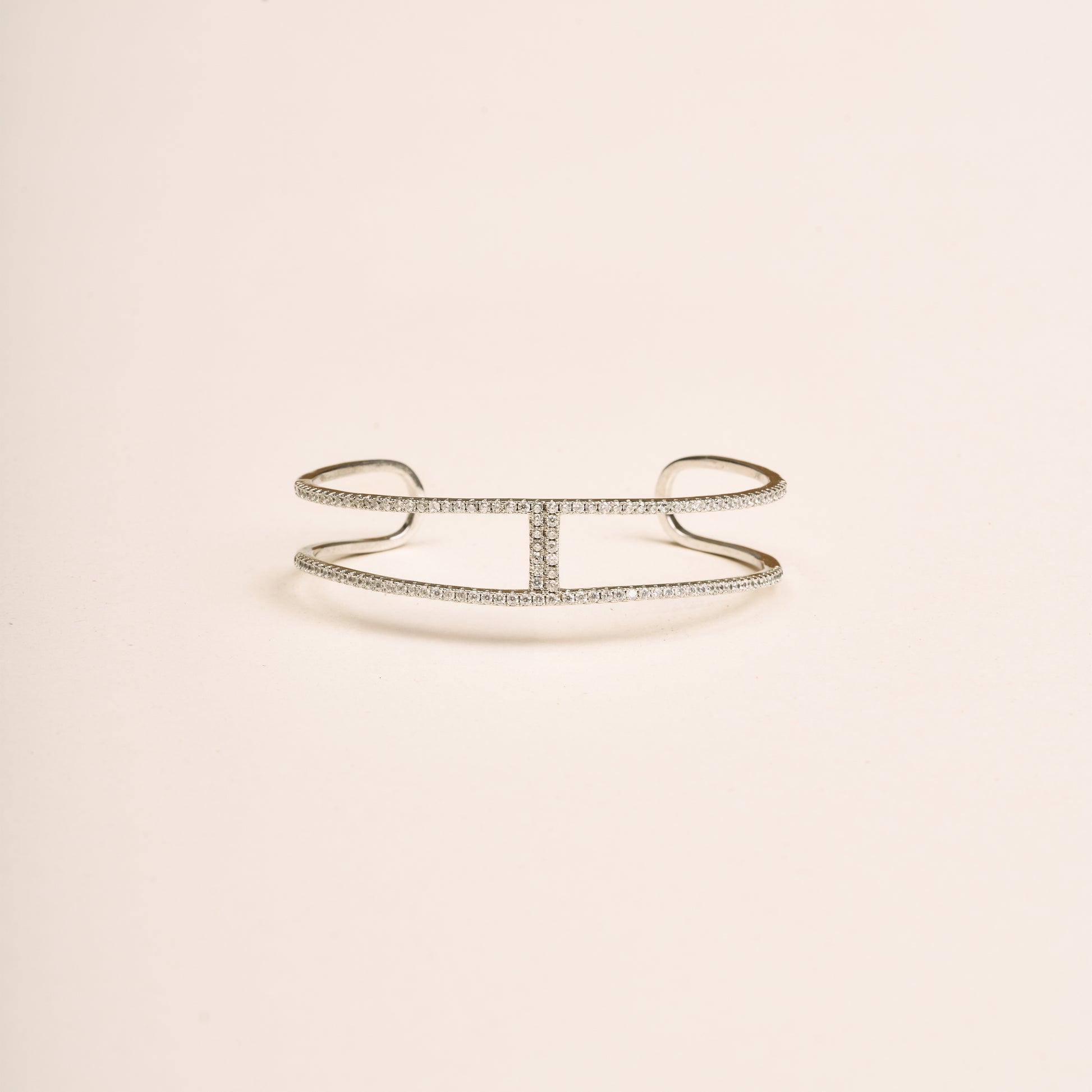 A bold rose gold cuff bracelet featuring a double-band design with a sleek vertical bar encrusted with crystals. Modern, elegant, and perfect for a sophisticated statement look.