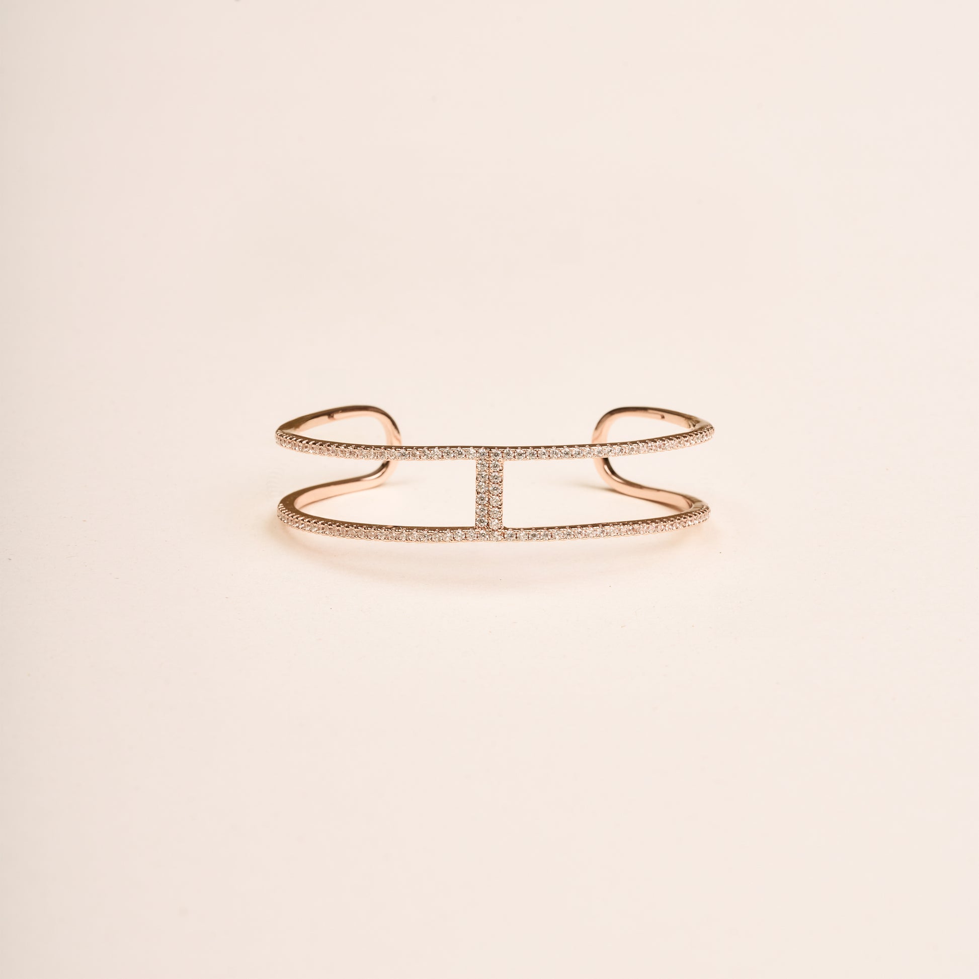 A bold silver cuff bracelet featuring a double-band design with a sleek vertical bar encrusted with crystals. Modern, elegant, and perfect for a sophisticated statement look.