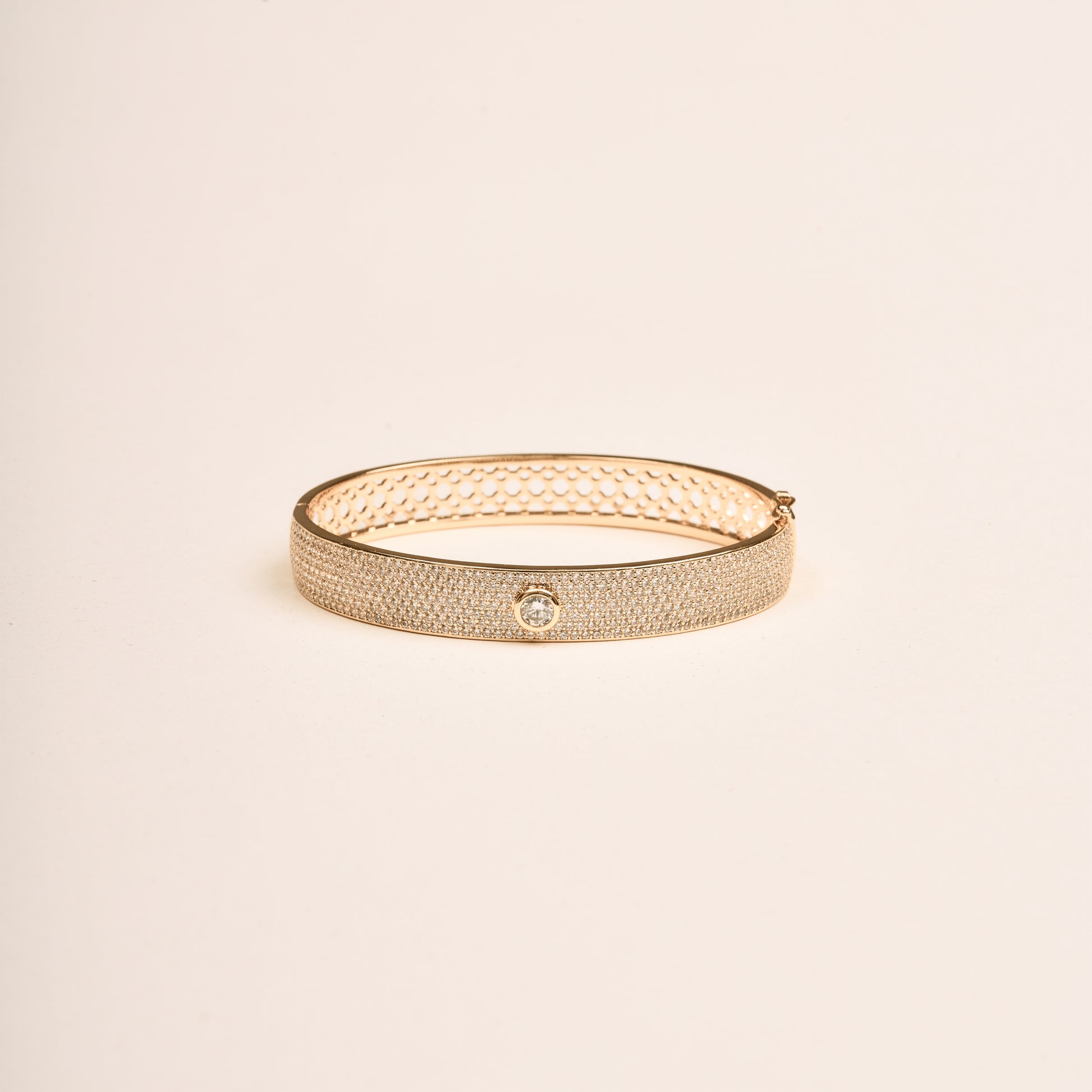 A sleek gold bangle fully adorned with sparkling stones and a central crystal detail. Elegant, timeless, and perfect to wear solo or stacked.