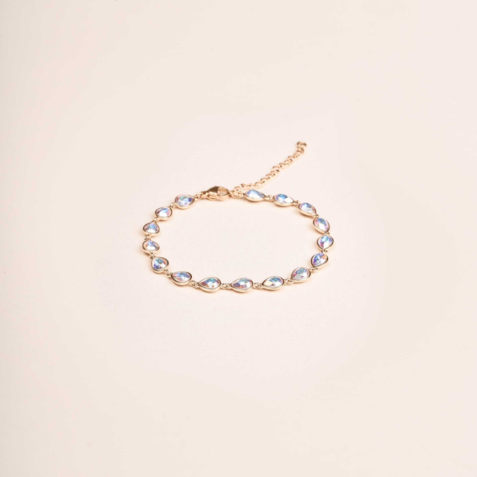 A dainty gold bracelet adorned with alternating blue and lilac teardrop stones. Lightweight, elegant, and perfect for adding a soft touch of color to any look.