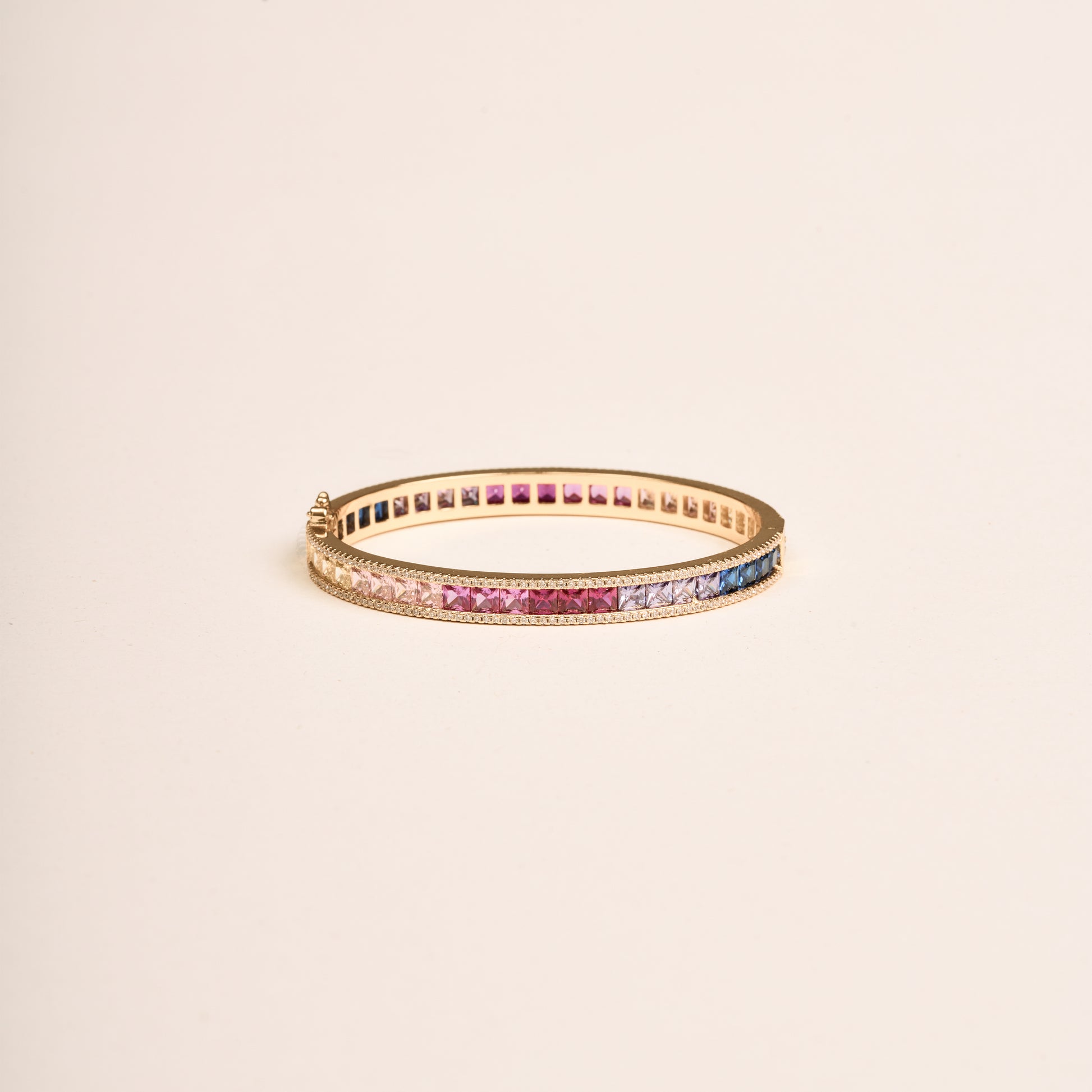 A slim gold bangle featuring a vibrant gradient of square-cut stones in pink, purple, and blue hues. A playful yet elegant accessory to brighten any look.