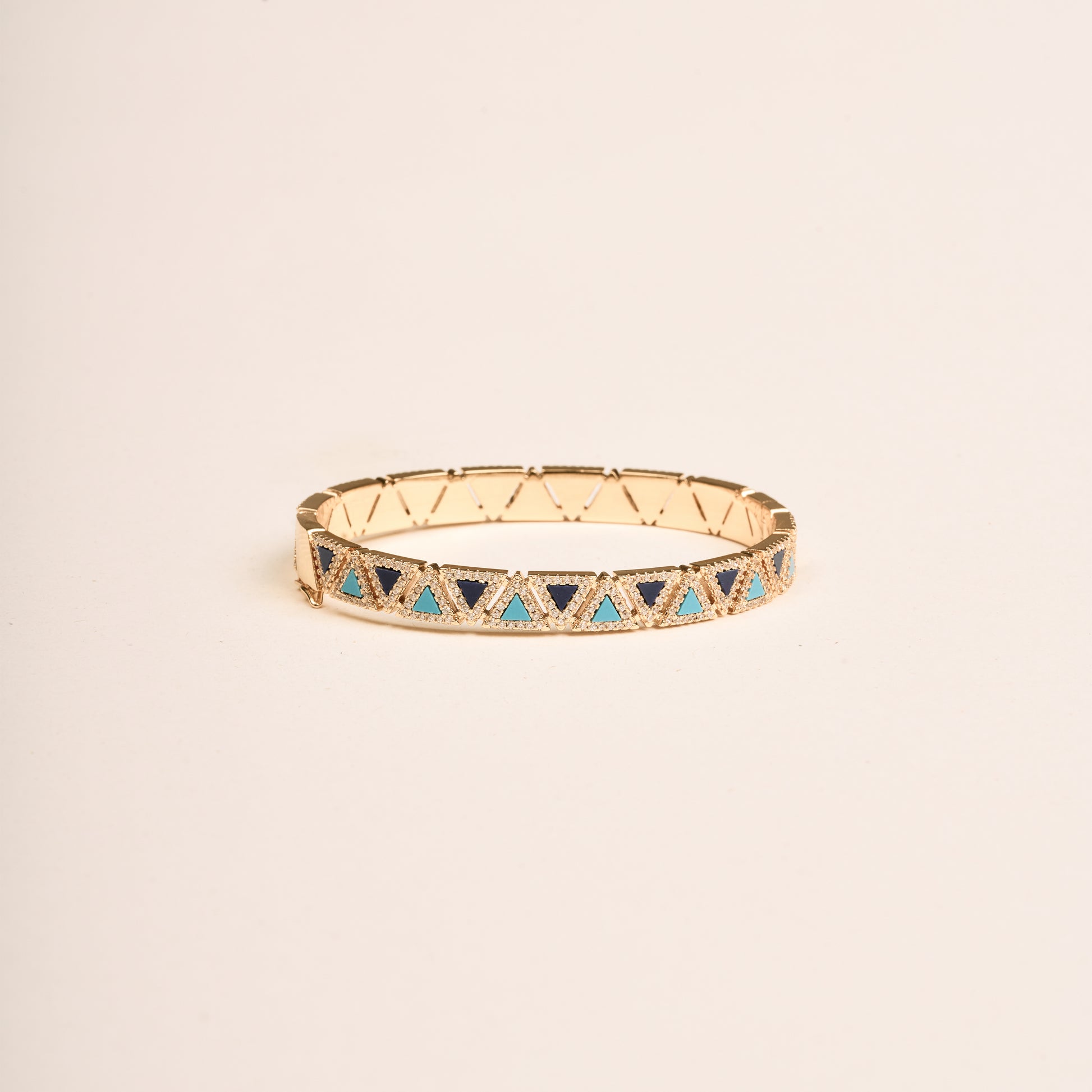 A striking gold bangle featuring a geometric pattern with deep blue and turquoise accents. A bold yet refined piece to add a pop of color and elegance to your look.