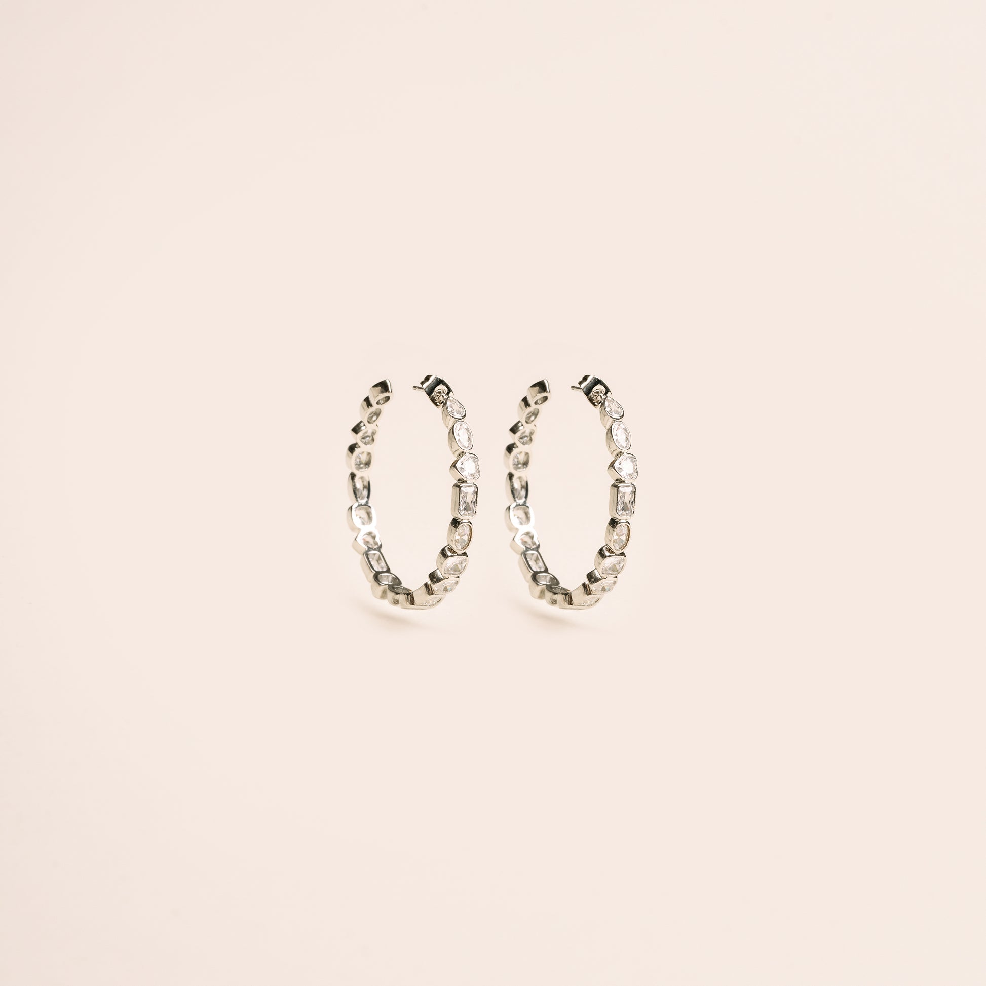 The Ala Hearth Hoops are a modern twist on the classic hoop, featuring alternating oval and baguette-cut cubic zirconia for a unique sparkle from every angle. Crafted in polished sterling silver, these hoops are versatile enough for daily wear while adding an elegant touch to any outfit.