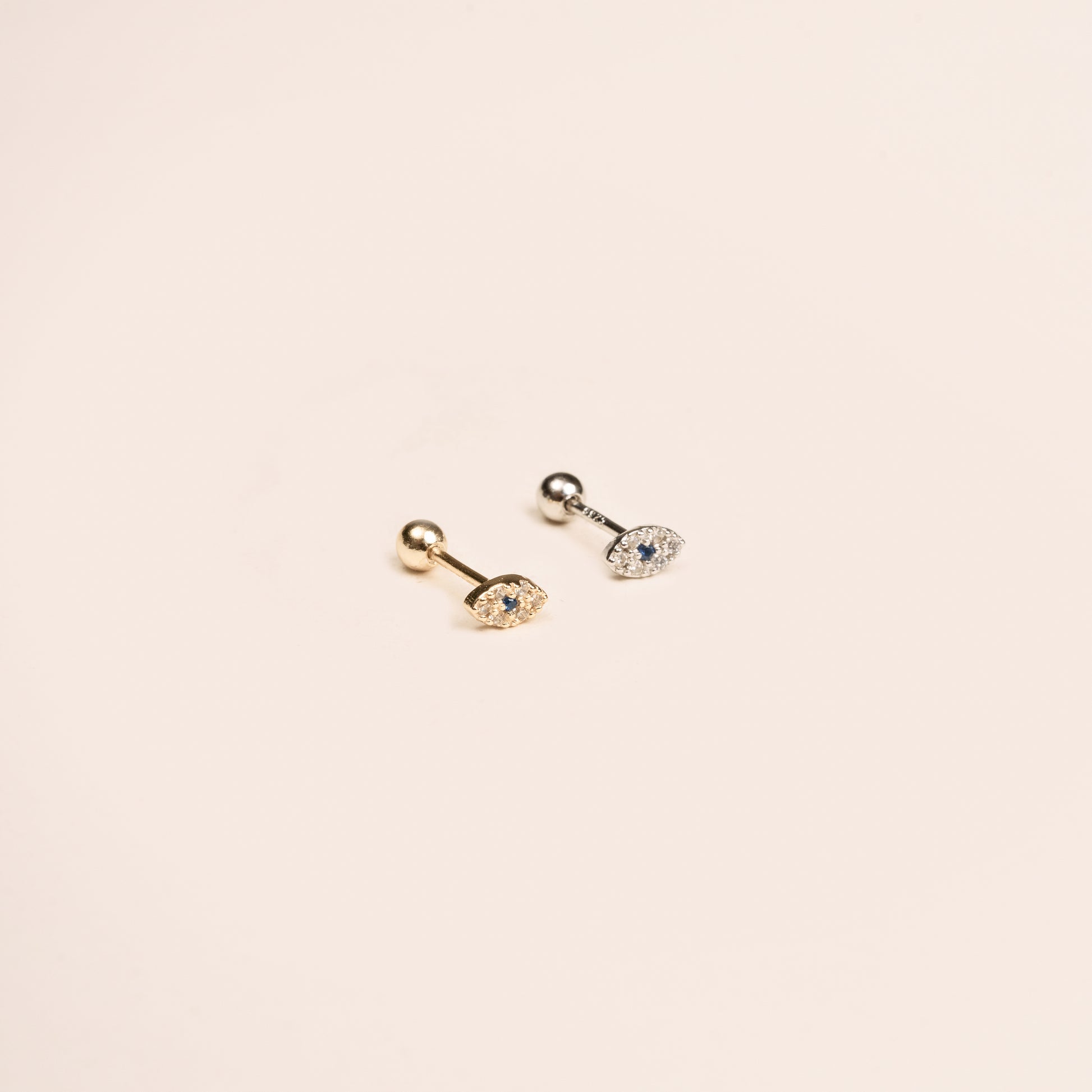 The Evil Eye Piercing is a delicate symbol of protection and style. Featuring a sapphire-colored cubic zirconia center surrounded by pavé-set stones, this piece is available in both gold-plated and sterling silver finishes. Designed for a snug fit, it’s perfect for tragus, lobe, or cartilage piercings, adding a subtle yet meaningful sparkle.