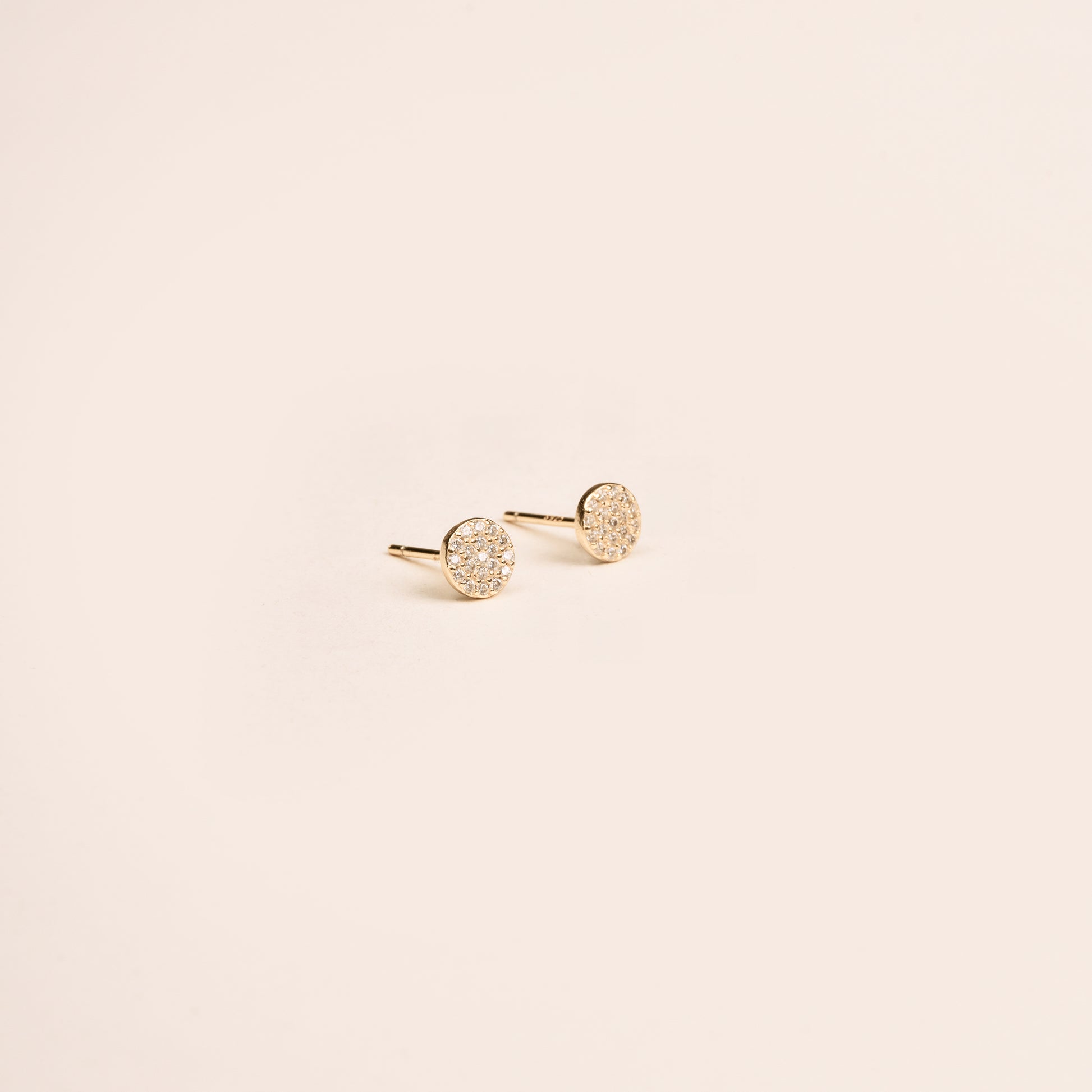 The Golden Halo Studs are a timeless jewelry essential. Featuring a perfectly round pavé of cubic zirconia set in a polished gold-plated base, these studs are designed to catch the light and add effortless elegance to any outfit. Ideal for both everyday wear and special occasions.
