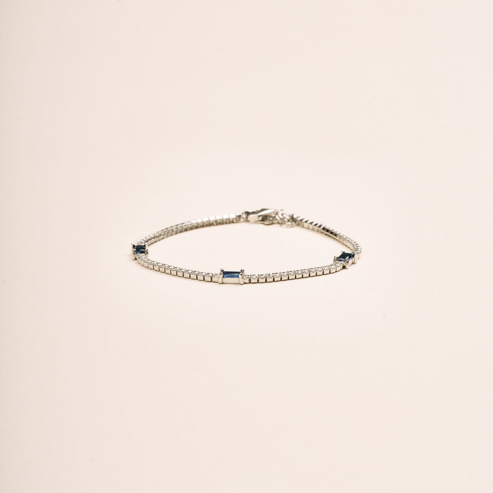 The Saphira Bracelet Tennis features deep blue stones spaced along a delicate silver chain, adding a subtle touch of sophistication. Perfect for stacking or wearing solo, this piece is designed for timeless elegance.