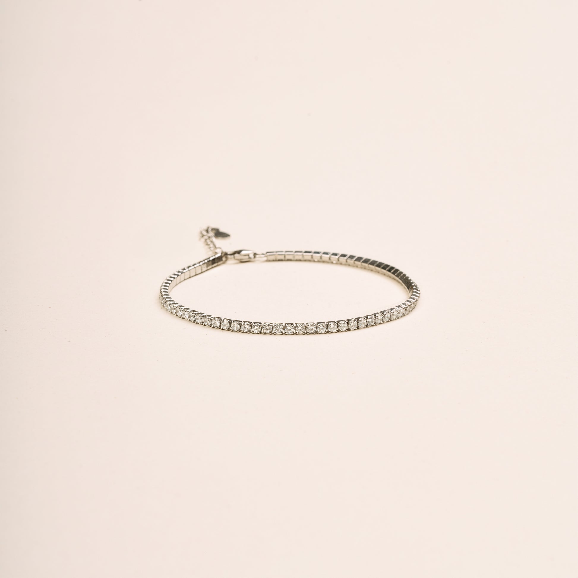 The Iris Tennis is a delicate, adjustable tennis bracelet featuring a row of sparkling stones in a sleek silver finish. Its refined, minimal design makes it perfect for layering or wearing solo for a subtle touch of elegance.
