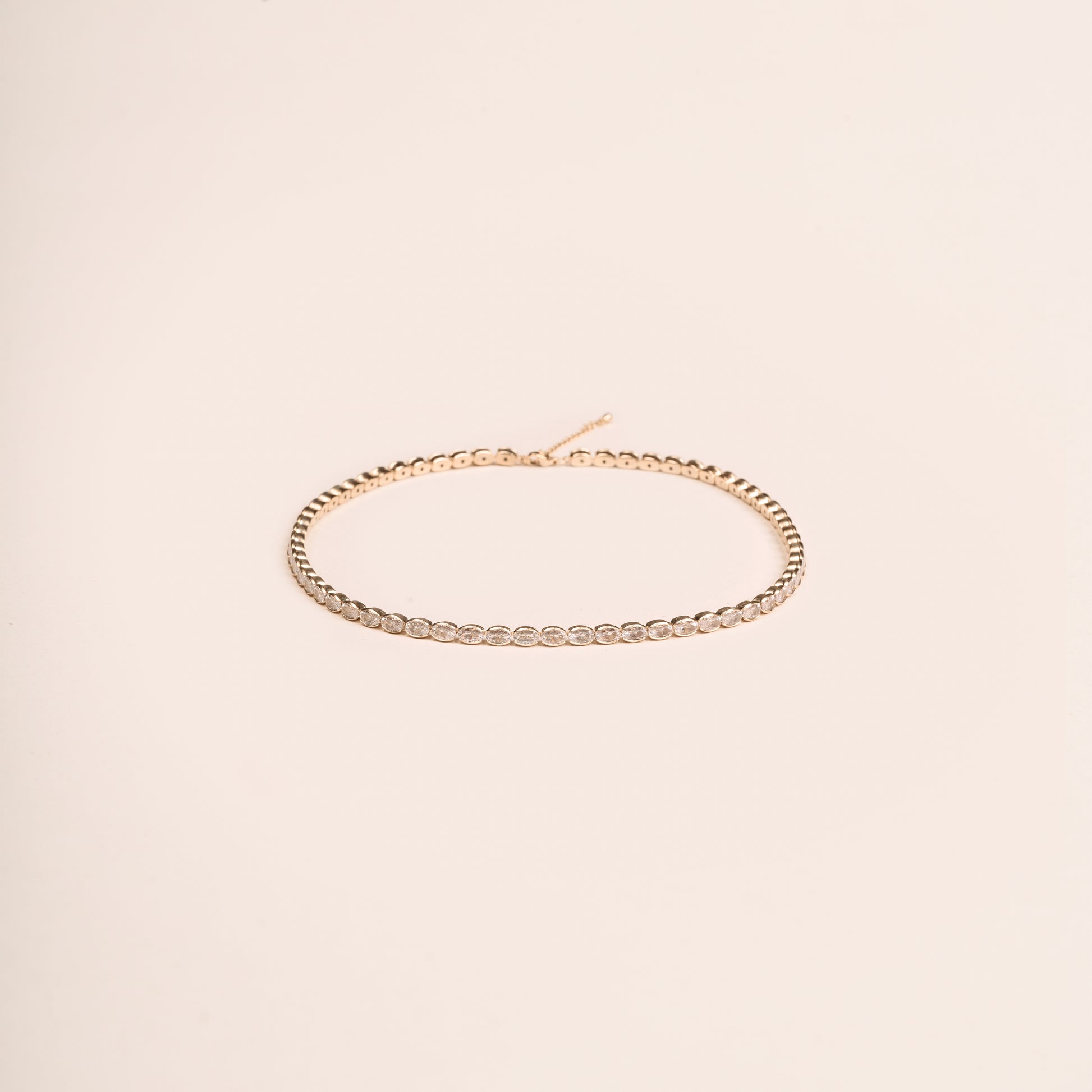 The Solenne Necklace features a sleek line of bezel-set stones that capture light with every movement. Elegant and versatile, it’s a timeless piece perfect for layering or wearing solo as a statement of refined style.